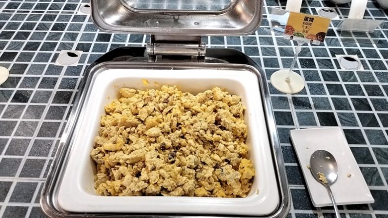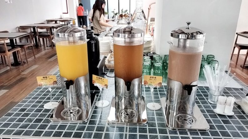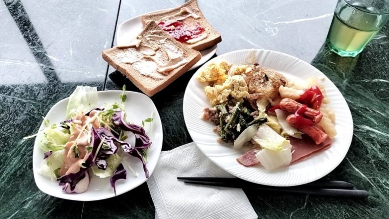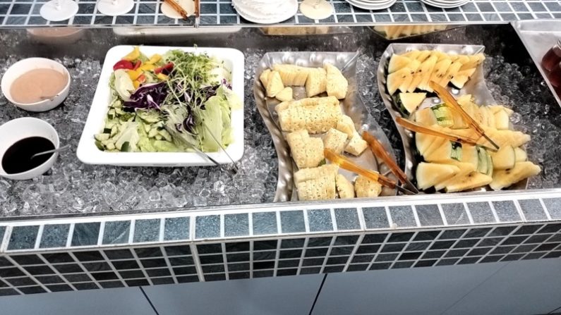 サラダ、フルーツとジュース(左から、オレンジ、りんご、アイスティー)。台湾だけでなく上海も、シンガポールでもそうでしたけど、サラダはどこもあまり食べないせいか、スペースも種類も少ないですね。