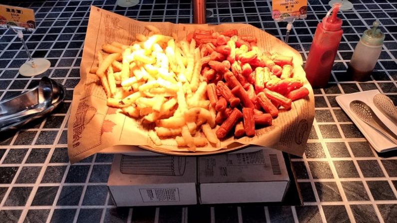 麻婆豆腐とポテトフライ、ポークンビッツみたいなの。
