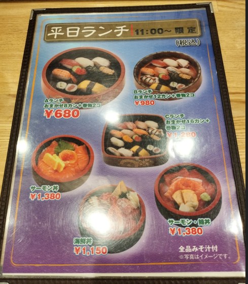 ランチは、Aランチ 握り8貫と巻物2個¥680、Bランチ握り12貫と巻物2個¥980、Cランチ握り16貫と巻物2個¥1280です。その他海鮮丼、サーモン鮪丼、¥1150~1380です。価格は税込みです。
