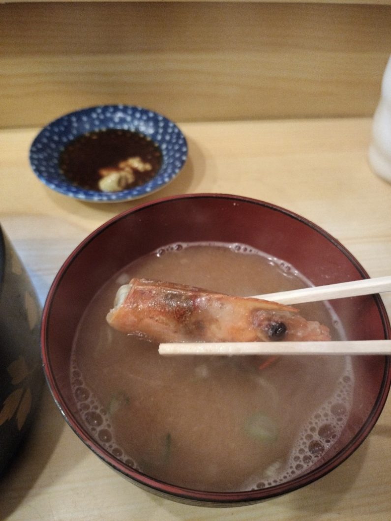 海老の頭の入った味噌汁です。これがおいしいですね。一杯目はサービス、2杯目は¥50-です。