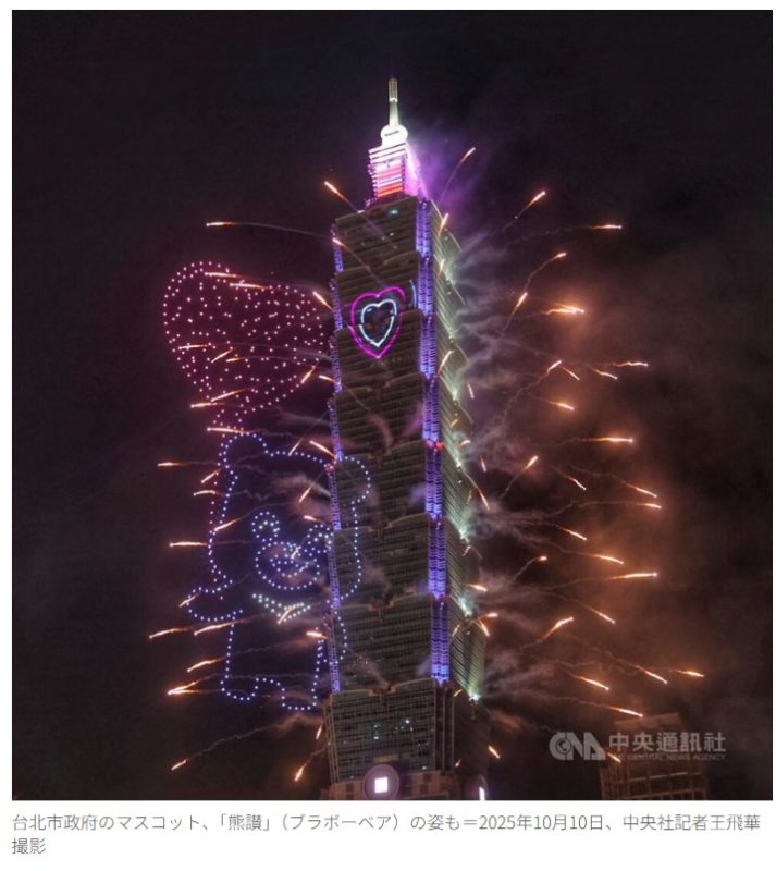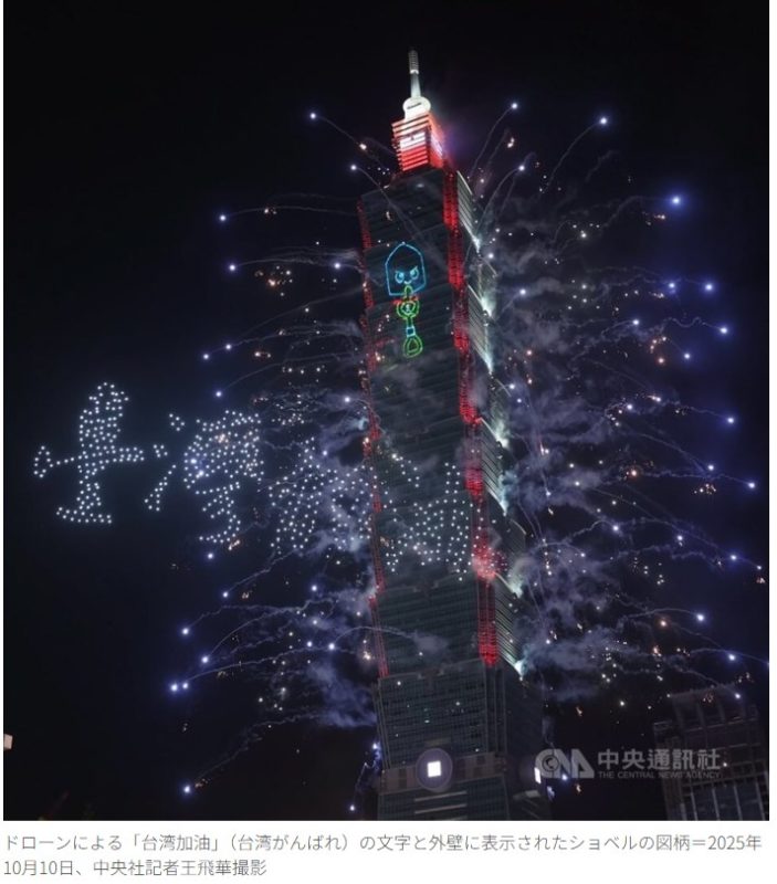 10日の中華民国国慶日(国家の日)を祝おうと、台北の超高層ビル「台北101」では同日、花火が打ち上げられた。ドローンショーやプロジェクションマッピングも併せて開催された。台北市政府の協力を得て実施した。お祝いのパフォーマンスは約12分にわたって繰り広げられ、台北の繁華街の夜空を華やかに彩った。(記事全文)