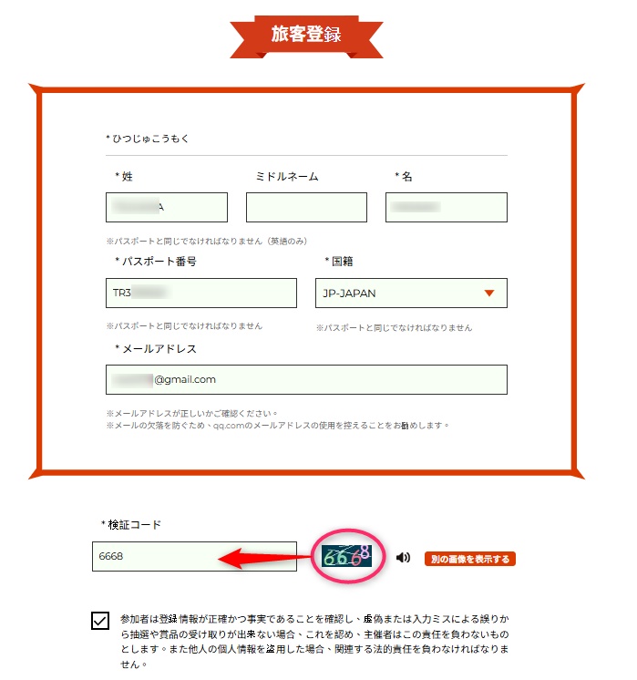 申し込み時は、氏名・パスポート番号・国籍・メールアドレスの入力をするだけです。氏名は必ずパスポートと同じ必要があります。